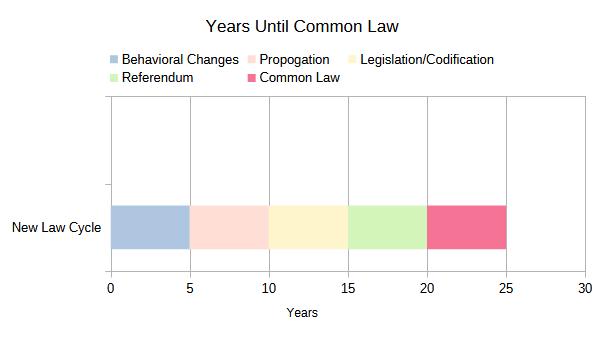 This provides a more reasonable platform for legislative requests, for addressing grievances, and for compatibility with other parts of the world that the United States may interact with. The chart shows that it takes about 5 years to document behavior changes through a legislative period. The time in between codification and common law analysis is a referendum, meaning a voting period where the people decide if all the laws are working well for everybody. During the common law period, this is normally a judicial review and it may resemble a board meeting with legislators and executive administrators. No matter what is decided, the behavior changes and propogation is only examined during the 10 year period prior to the legislative session.