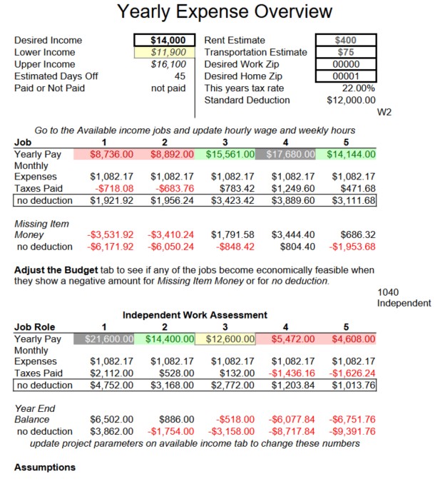 Yearly pay correlates to the numbers at the top of the budget sheet. Green is most likely yes, red is likely not, yellow is maybe but low income.
