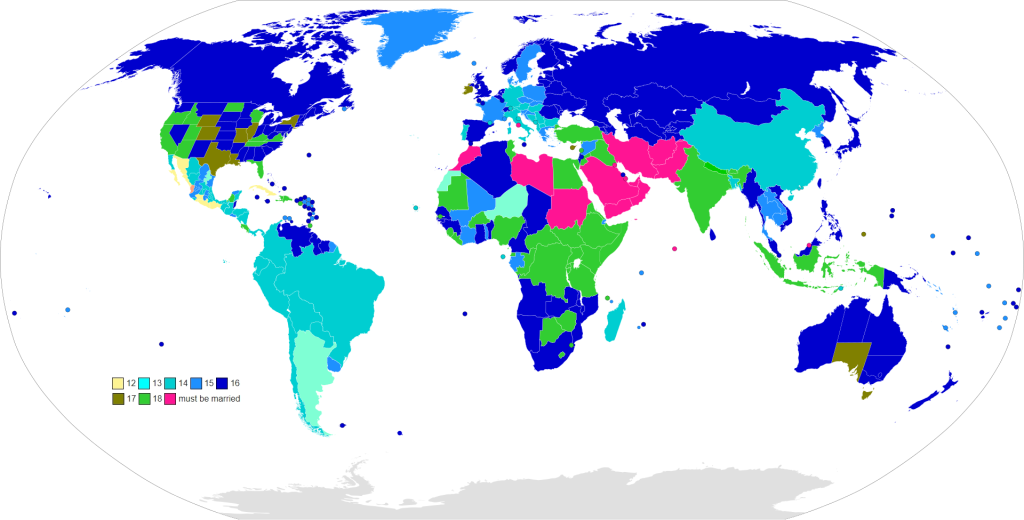 This image was obtained from the public domain and has been modified. The original image can be found here: https://en.wikipedia.org/wiki/Age_of_consent by clicking through on the first image. If the image has changed, notate the date of this publication and find the article and image with the date that is most recent, but before this article date. Public domain has a cc0 notation and requires registration and financial assesment. https://chooser-beta.creativecommons.org/ https://creativecommons.org/public-domain/cc0/